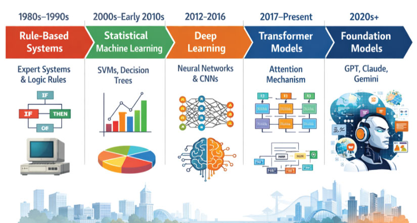 Artificial Intelligence has evolved through a series of profound conceptual shifts rather than steady, incremental improvements. Each phase redefined how machines interpret data, learn patterns, and interact with the world. What began as rigid, rule-driven systems has transformed into highly adaptive and generative models such as GPT, Claude, and Gemini.