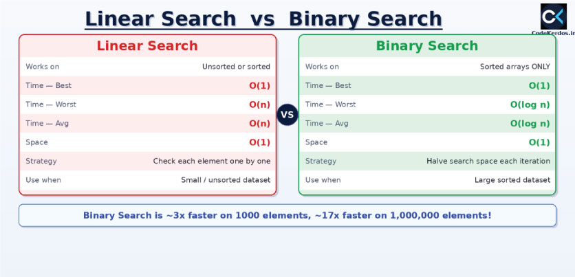 | Feature | Linear Search | Binary Search |