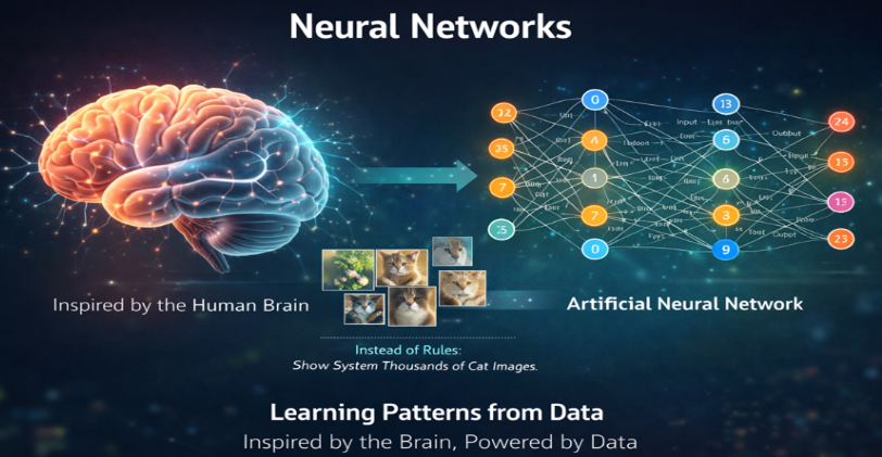 At a high level, neural networks are inspired by the human brain. In our brain, neurons receive signals, process them, and pass them forward. Neural networks follow a similar idea, but instead of biological signals, they use numbers, weights, and mathematical functions.