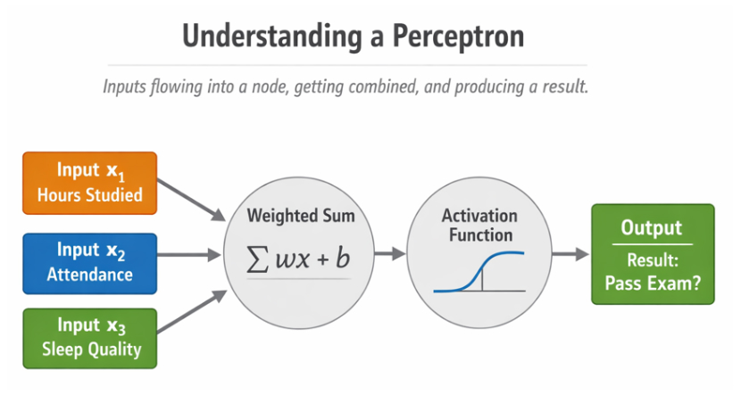 Each factor contributes differently. The perceptron combines them to make a prediction.